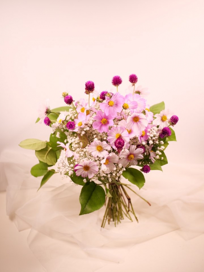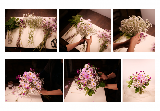코스모스 꽃다발을 만들때 코스모스의 가볍고 여린분위기를 잘 살리기 위해 제가 즐겨 사용하는 서브소재는 안개꽃입니다. 안개꽃을 먼저 동그랗게 모아 잡고 묶은 후에 안개꽃위로 코스모스를 높낮이에 변화를 주면서 자유롭게 꽂아요. 안개꽃이 오아시스처럼 꽃을 고정하는 역할을 해주어서 코스모스만 잡는 것보다 더 쉽게 잡을 수 있죠. 좀 더 경쾌한 느낌을 주고 싶다면 톡톡튀고 방울같은 천일홍을 더 해줍니다. 마지막 마무리는 전체 다발을 보호하듯 레몬잎으로 감싸주고 바인딩 포인트를 묶어주면 됩니다.