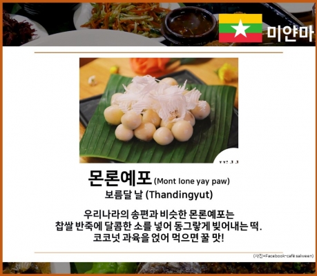 우리나라의 송편과 비슷한 몬론예포는 찹쌀 반죽에 달콤한 소를 넣어 동그랗게 빚어내는 떡. 코코넛 과육을 얹어 먹으면 꿀 맛!