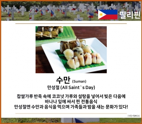 찹쌀가루 반죽 속에 코코넛 가루와 설탕을 넣어서 빚은 다음에 바나나 잎에 싸서 찐 전통음식 만성절엔 수만과 음식을 먹으며 가족들과 밤을 새는 문화가 있다!