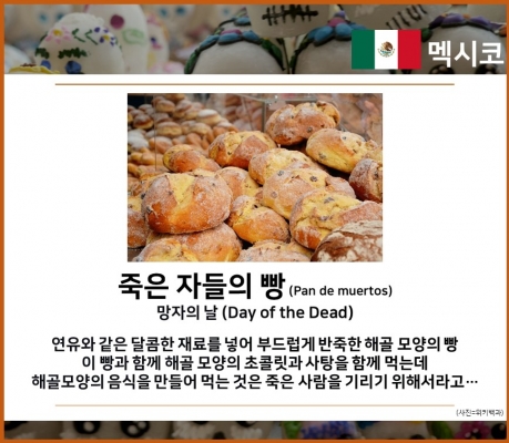 연유와 같은 달콤한 재료를 넣어 부드럽게 반죽한 해골 모양의 빵이 빵과 함께 해골 모양의 초콜릿과 사탕을 함께 먹는데 해골모양의 음식을 만들어 먹는 것은 죽은 사람을 기리기 위해서라고…
