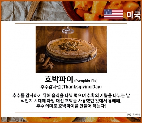 추수를 감사하기 위해 음식을 나눠 먹으며 수확의 기쁨을 나누는 날. 식민지 시대에 과일 대신 호박을 사용했던 것에서 유래돼, 추수 의미로 호박파이를 만들어 먹는다!