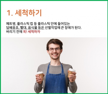 페트병, 플라스틱 컵 등 플라스틱 안에 들어있는 담배꽁초, 빨대, 음식물 등은 선별작업에 큰 장애가 된다. 버리기 전에 꼭! 세척하자.