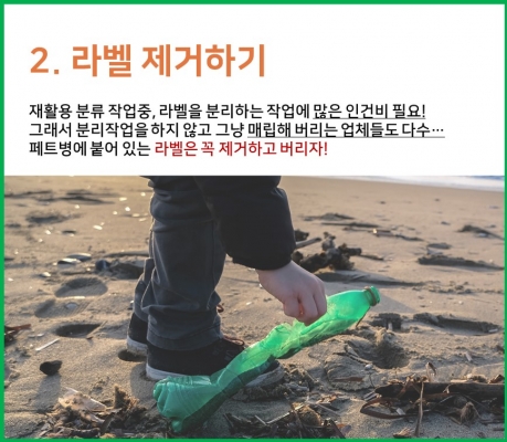 재활용 분류 작업중, 라벨을 분리하는 작업에 많은 인건비 필요! 그래서 분리작업을 하지 않고 그냥 매립해 버리는 업체들도 다수… 페트병에 붙어 있는 라벨은 꼭 제거하고 버리자!