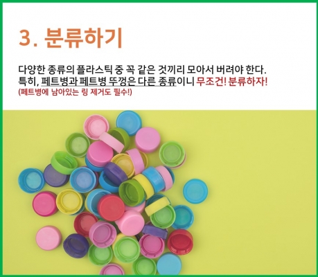 다양한 종류의 플라스틱 중 꼭 같은 것끼리 모아서 버려야 한다. 특히, 페트병과 페트병 뚜껑은 다른 종류이니 무조건! 분류하자! (페트병에 남아있는 링 제거도 필수!)