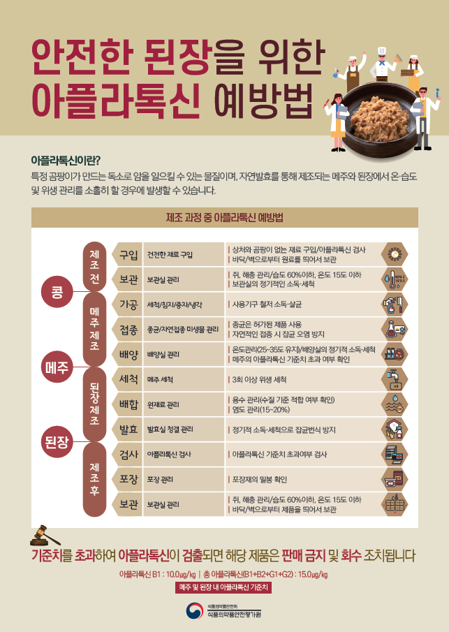 이번 수거‧검사는 한식된장·메주의 아플라톡신 오염 여부를 조사하던 중에 기준을 초과하는 사례가 발생해 해당업체에서 생산된 제품의 안전성을 확인하기 위해 실시했다. 그 결과, 한식된장 33개 제품이 아플라톡신 기준(B1, B2, G1, G2의 합으로서 15 . 0 μg/kg 이하)을 초과한 것으로 확인됐다. 한식메주 제품은 모두 적합한 것으로 나타났다.