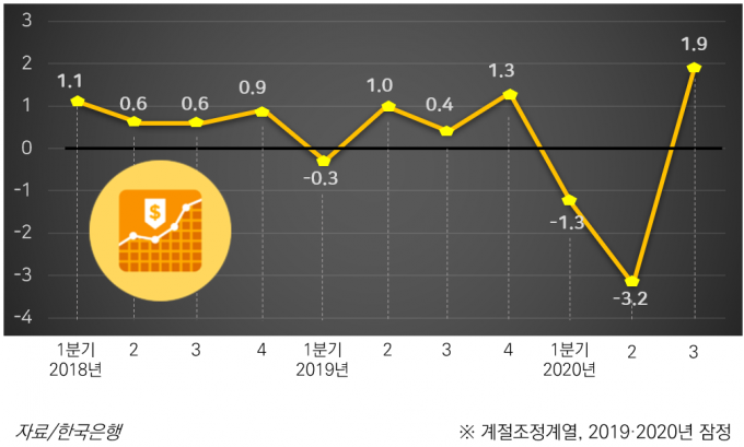 한국은행은 2020년 3분기 실질 GDP가 전기보다 1.9% 성장했다고 27일 밝혔다. 전년동기와 비교하면 1.3% 감소했다. 실질 국내총소득(GDI)은 전기보다 2.5% 증가, GDP 증가폭을 웃돌았다. 올들어 1분기 -1.3%, 2분기 -3.2%로 감소세를 보이던 GDP가 3분기만에 다시 증가세로 돌아선 것이다. 특히 1.9% 성장은 2010년 1분기(2.0%) 이후 10여년만에 최대폭이다.