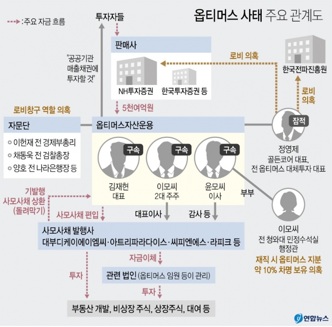 당시 옵티머스는 '적기시정조치'에서 벗어나기 위해 엄청난 로비활동을 했다는 정황이 '펀드 하자 치유' 문건과 자문단 녹취록 등이 속속 공개되면서 만천하에 드러났다. 옵티머스는 이헌재 전 경제부총리, 채동욱 전 검찰총장, 양호 나라은행 전 총장, 김진훈 전 군인공제회장 등을 자문단으로 뒀다.