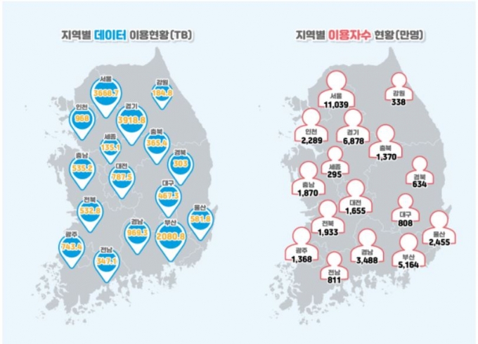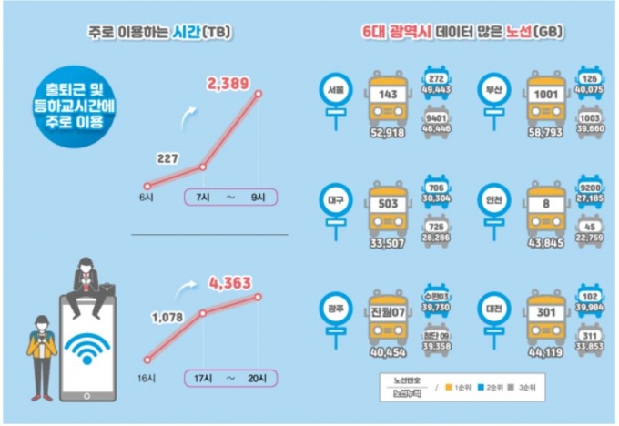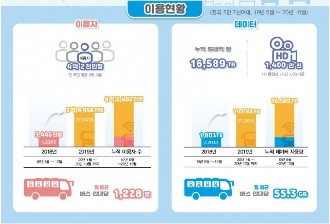2019년 5월~2020년 10월까지 18개월동안 시내버스 와이파이 누적 이용자수는 4억2000만명, 누적 데이터량은 1만6000여 테라바이트(TB)로 집계됐다. 이는 고화질(HD)급 영화 1400만편을 시청한 것과 같은 것으로, 버스 와이파이가 우리나라 국민 생활 깊숙이 자리잡고 있다는 것을 의미한다.