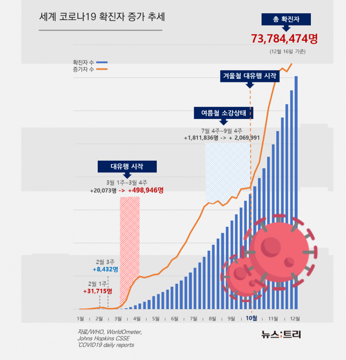 영국을 시작으로 미국과 캐나다에서 코로나19 백신 접종은 시작됐지만 신종 코로나 바이러스(코로나19)는 더 빠르게 확산되면서 전세계 확진자수가 7300만명을 넘어섰다.