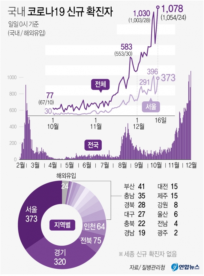 국내 상황도 최악으로 치닫고 있다. 16일 신규 확진자수는 역대 최대인 1078명을 기록하면서 누적확진자수가 4만5442명으로 불어났다. 지역별로 보면 수도권이 일평균 608.4명으로 전체의 73.1%를 차지했다. 비수도권은 일평균 224.1명으로 권역별로는 경남권 78.9명, 충청권 58명, 경북권 34명, 호남권 30명, 강원권 16.3명, 제주권 7명 등으로 나타났다.