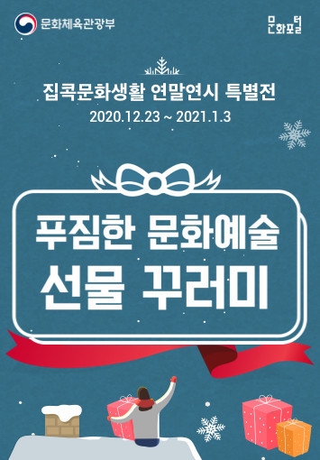 문화체육관광부는 23일~2021년 1월 3일까지 국공립 문화예술기관이 제공하는 비대면 공연, 전시, 행사 등을 한자리에서 쉽게 볼 수 있는 통합안내 누리집 '집콕 문화생활 연말연시 특집'을 운영한다. 이를 통해 국민들은 코로나19로부터 안전하고 색다른 '집콕 연말'을 보낼 수 있게 됐다.