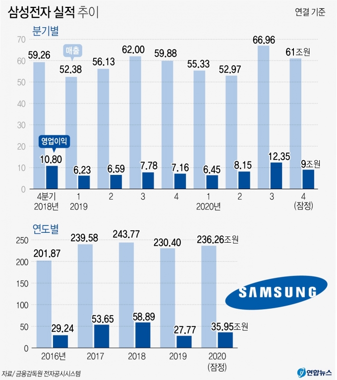 삼성전자가 코로나19가 창궐한 지난해 36조원 가까이 벌었다. 코로나로 인해 집콕 생활이 늘어나고 재택근무자들이 많아지면서 반도체 등 삼성전자의 주력상품 수요는 오히려 증가하면서 2019년보다 영업이익이 많아진 것이다.