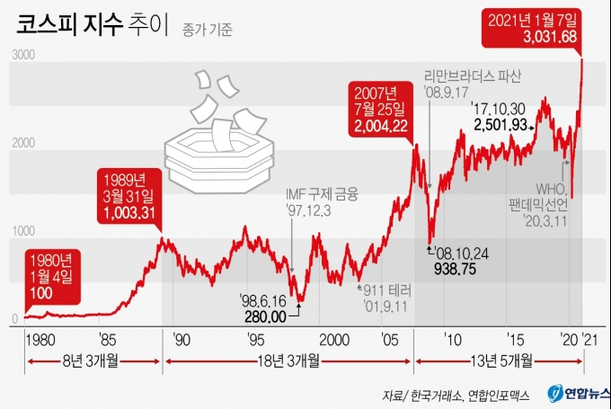 이에 대해 김학균 신영증권 리서치센터장은 "하늘에서 떨어진 돈이 아니라 그동안 축적한 금융자산이 저금리를 못 이겨 주식시장으로 들어오는 것"이라며 "지난해 3분기말 기준 금융자산 4325조원 중 주식이 852조원이고 이자도 안주는 예금이 1931조원에 이른다"고 설명했다.