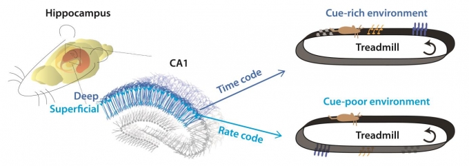 물체가 없는 환경의 기억은 CA1 표면층에 있는 세포 집단이 활성화되면서 신경세포 하나가 활동전위를 발생시키는 횟수인 빈도 코드(rate code)를 통해 저장된다. 반면에 물체가 풍부한 환경의 기억은 CA1 심층부 세포 집단이 활성화되면서 여러 신경세포에서 발생하는 활동전위 사이의 시간적 간격인 위상 코드(phase code)를 이용해 저장되는 것으로 확인됐다.