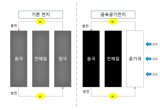 금속공기전지는 금속과 공기를 전지의 음극과 양극으로 활용해 전력을 발생시키는 전지다. 금속공기전지는 기존 전지와 비교해 세 가지 이점을 갖고 있다. 첫째 더 나은 성능이다. 화학적으로 안정된 금속을 쓰기 때문에 에너지 밀도가 높다. 둘째 경제성이다. 양극이 공기로 대체되므로 부피가 줄었다. 또 공기를 활용하기 때문에 소재 비용도 낮다. 셋째 안전성이다. 오염물질이나 탄소배출량이 적고, 폭발이나 화재 염려가 없다.