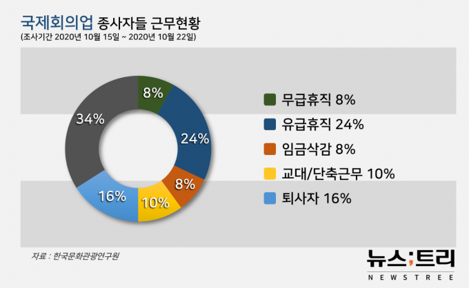 이 때문에 업계 종사자들의 근무환경도 불안정하다. 한국문화관광연구원의 보고서에 따르면 국제회의업 종사자들 대부분이 코로나 이후 정상적으로 근무하지 못하고 있다. 무급휴직 8%, 유급휴직 24%, 임금삭감 8%, 교대·단축근무 10% 그리고 퇴사자도 16%나 됐다. 10명 중 3명만 정상근무하고 있는 것이다.