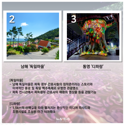 1일 한국관광공사 경남지사는 코로나19에서도 안심하고 여행할 수 있는 '안심 나들이' 10곳을 발표했다. 안심나들이로 선정된 10곳은 △진주 진주성 △남해 독일마을 △통영 디피랑 △합천 영상테마파크 △김해 가야테마파크 △창원 진해해양공원 △하동 삼성궁 △거제 내도 △고성 당항포관광지 △사천 바다케이블카 등이다.