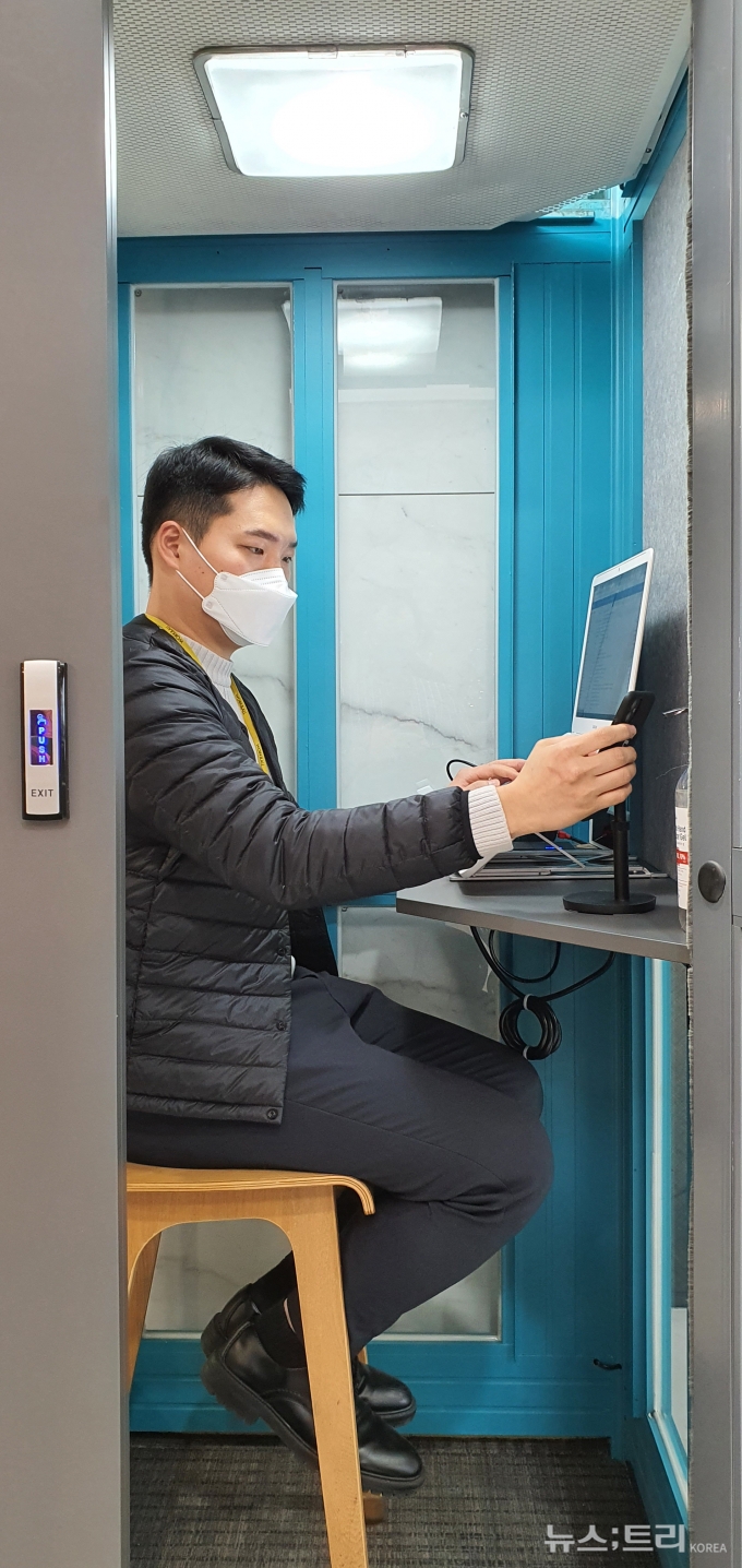 아라부스는 공중전화부스를 재활용한 1인용 사무·놀이 공간이다. 위치 역시 기존 공중전화 부지가 아닌 카페, 사무실 등 다양한 곳에 배치할 수 있어 활용성을 높였다. 유동 인구가 많은 공간에서도 외부 소음을 효과적으로 차단할 수 있어 집중력이 필요한 업무를 처리하는 데에도 적합하다. ▲아라부스 사용 모습.(사진=KT링커스)
