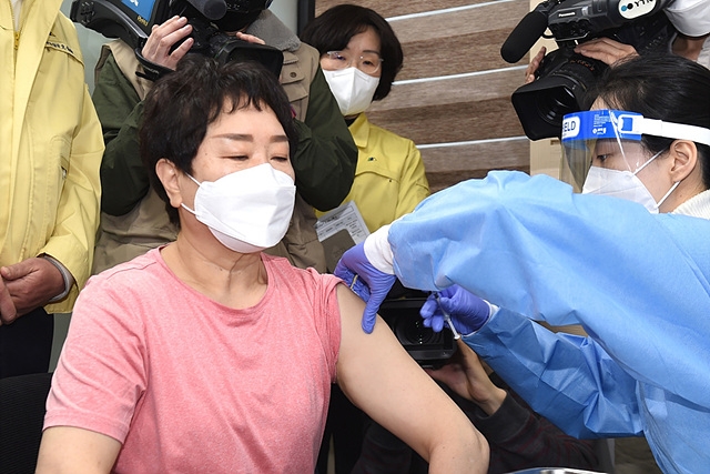 ▲26일 오전 서울 노원구보건소에서 요양보호사 이경숙씨가 국내에서 처음으로 코로나19 백신을 접종받고 있다.(사진=연합뉴스) 이씨를 시작으로 이날 오전 9시부터 전국적으로 코로나19 백신 접종이 시작됐다. 백신을 맞은 요양병원이나 병원 관계자들은 대부분 이상증세를 느끼지 못했고, 하루라도 빨리 코로나19가 종식돼 평범한 일상으로의 복귀를 희망했다.