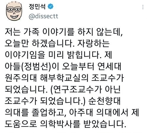'만화가 의사'로 유명한 정민석 아주대학교 의과대학 해부학과 교수가 SNS에 '아들이 조교수가 됐다'고 자랑하는 글을 올렸다가 '아빠 찬스' 의혹에 휩싸였다.