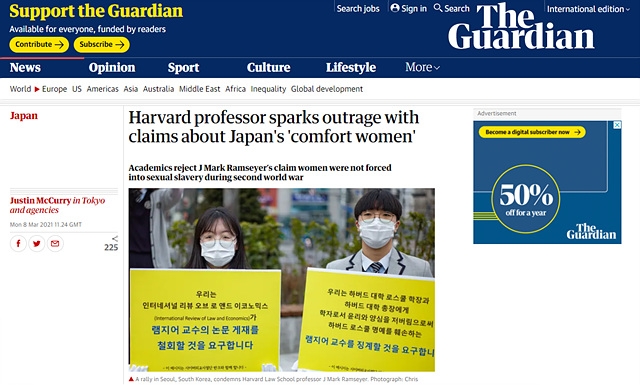 영국의 일간지 '가디언'(The Guardian)은 8일 "하버드 교수가 일본의 '위안부' 관련 주장으로 격노를 유발하다"라는 제목의 기사를 통해 '위안부'를 자발적 매춘부로 규정한 램지어 교수의 주장으로 촉발된 사태의 경과를 보도했다.