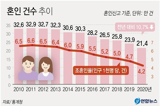 혼인 건수는 2012년부터 9년째 감소세다. 1996년까지만 해도 43만건에 달했던 혼인 건수는 1997년 외환위기를 거치며 30만건대로 떨어진 뒤 2016년 20만건대까지 추락했다. 이후에도 꾸준히 줄면서 간신히 20만건대를 유지하고 있다. 인구 1000명 당 혼인 건수를 뜻하는 조혼인율은 4.2건으로 전년 대비 0.5건 줄면서 역시 사상 최저치다.