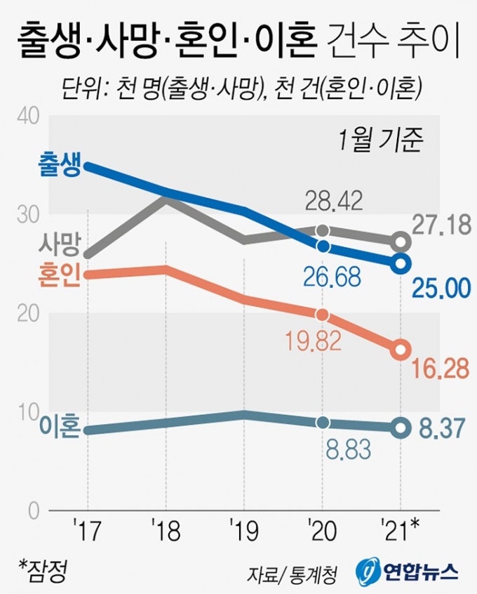 이에 따라 1월 인구 자연증가분(출생아-사망자)은 -2177명으로 집계됐다. 2019년 11월부터 15개월째 마이너스다. 다만 사망자 수가 줄면서 1월 인구 자연감소폭은 작년 12월 7323명보다 줄었다.