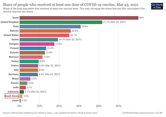 23일 기준 백신을 1회라도 접종 받은 인구 비율이 가장 높은 나라는 이스라엘(60%)이었다. 그 뒤로 영국이 41.7%, 칠레가 30.8%로 순위를 이었다. 지난달 26일을 기점으로 우리나라는 인구의 1.4%가 백신을 접종했으며, 우리보다 백신접종을 일찍 시작한 일본은 0.5%에 그쳤다.