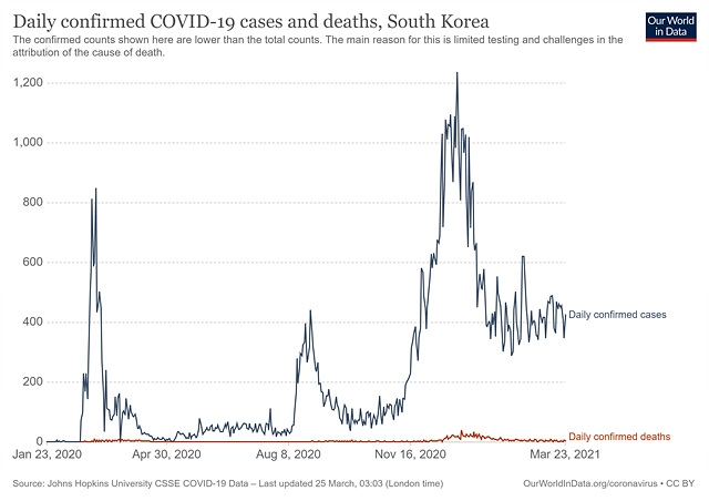우리나라 누적 확진자 수는 전세계 84위로 주요국 대비 양호하다. 1월 19일 첫 확진자가 발생한 이래로 세 차례의 대유행을 겪었고 지난해 12월 25일 일일 확진자 수 1240명으로 정점을 찍었지만 최근 들어 연일 400명대를 기록하며 상대적인 하락세에 접어든듯 보인다.