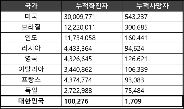 가장 많은 누적 확진자가 발생한 나라는 미국이다. 25일 기준 3000만여명이 발생했다. 미국은 누적 사망자 수 역시 1위로 53만여명에 달한다. 2위는 1200만여명의 확진자와 30만여명의 사망자가 발생한 브라질, 3위는 1170만여명의 확진자와 16만여명의 사망자가 발생한 인도다. 그 뒤로 러시아, 영국, 이탈리아, 프랑스, 독일 등 유럽 국가가 순위를 이었다.