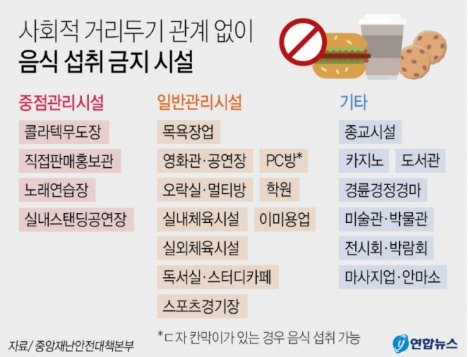 음식섭취 금지 대상은 콜라텍·무도장, 직접판매홍보관, 노래연습장, 실내스탠딩 공연장(이상 중점관리시설), 목욕장업, 영화관·공연장, 오락실·멀티방, 실내체육시설, 실외체육시설, 독서실·스터디카페·스포츠 경기장, PC방, 학원, 이미용업(이상 일반관리시설), 종교시설, 카지노, 경륜·경정·경마, 미술관·박물관, 도서관, 전시회·박람회, 마사지업·안마소(기타 시설) 등이다.
