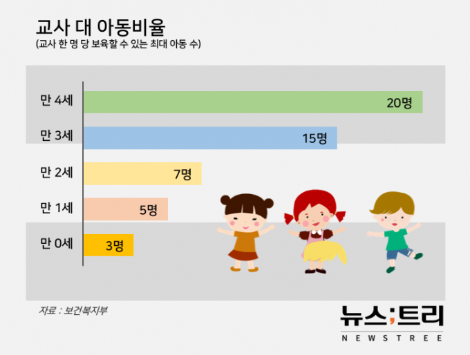 어린이집 교사들의 선제검사로 교사 대 아동비율도 위태로워질 수 있다. 현재 보건복지부 지침에 따른 교사 대 아동비율은 만 0세는 1:3, 만 1세 1:5, 만 2세 1:7, 만 3세 1:15, 만 4세 1:20이다. 교사 대 아동비율은 교사 1명이 동시에 돌볼 수 있는 아동의 수를 의미한다. 현재 모든 어린이집은 이런 비율에 맞춰 보육교사를 채용해야 한다.