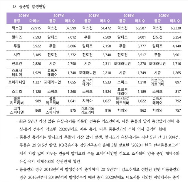 반면 품종견의 경우 2016년 2만9728건에서 2018년 3만4304건까지 증가했다가 2020년 2만2605건으로 감소하는 양상을 띠었다. 품종견의 경우 어느 정도 키우다 유기되는 경우가 많아 분양전 사전교육 의무화를 하고 있다. 그 결과 보호자들이 양육 중 발생할 수 있는 어려움과 비용 등을 사전에 충분히 숙지하면서 유기건수가 크게 줄어들었다.