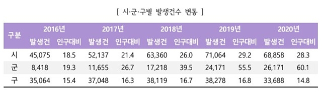 구(區) 단위 지자체는 2016년 3만5000건에서 2020년 3만3000건으로 감소했지만, 군 단위 지자체는 8418건에서 2020년 2만6171건으로 크게 증가했다.
