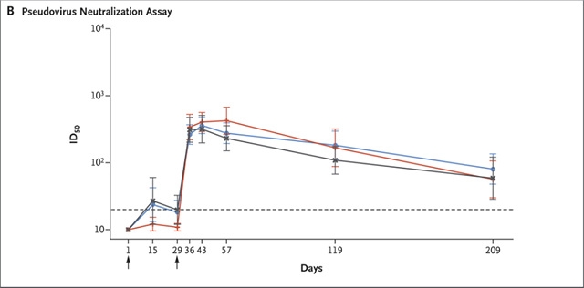 모더나 백신 2차 접종 후 209일째 되는 날 중화 항체의 농도는 모든 경우 50% 이상을 유지했다. 중화 항체 농도가 감소하더라도 기억 세포에 정보가 저장된다. 이 때문에 바이러스 감염시 면역학적 기억이 즉시 발동해 대량의 중화 항체를 신속하게 재차 만들어낼 수 있다.