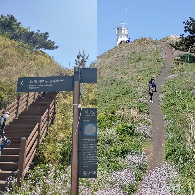 정상에 우뚝 선 비양등대. 흰색의 우아함을 뽐내고 있다. 우아한 자태로 수많은 배들의 안전운항을 책임지고 있다. 차귀도 등대와 함께 제주의 명소다. 비양등대에서 내려다보는 제주의 바다. 주변의 바다가 온몸을 휘 감는다. 가슴이 확 트인다. 환상이다. 해변에서 보는 바다와 또다른 절경이다.