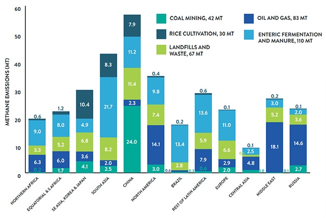 보고서는 지역별 주요 메탄가스 배출 분야도 구분해 다뤘다. 이를 통해 각국이 메탄 저감을 위해 특별히 더 힘써야 하는 부분을 확인할 수 있다. 우리나라를 비롯한 동아시아 지역의 경우 주요 메탄가스 배출원은 벼농사였으며, 뒤이어 폐기물 매립지에서 배출되는 메탄가스 비중이 두번째로 높았다.