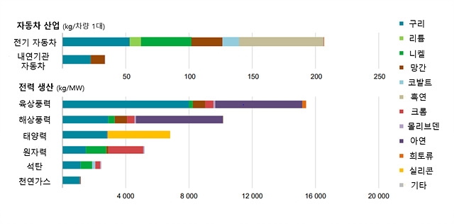 세계적으로 전기 자동차 판매량은 지난해에 비해 41% 늘어 300만대가 팔렸다. 그런데 전기 자동차에 투입되는 광물자원의 양은 기존 내연기관 차량의 6배다. 또 육상풍력발전기에는 가스발전소에 투입되는 광물자원의 9배가 필요하다.
