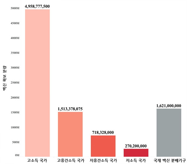 미국 듀크대학교 조사결과에 따르면 7일 기준 전세계 백신 생산량은 91억회분에 달했다. 이는 인류 전체가 맞아도 충분한 백신의 양이다. 그런데 몇몇 고소득 국가들은 이 가운데 65억회분이나 차지하고 있다보니, 저소득 국가들에게 돌아갈 백신이 거의 없는 상태다. 앞으로 생산될 백신들도 고소득 국가들이 이미 예약해놓은 물량이 대부분이다.
