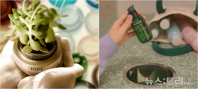 이니스프리는 그린티 씨드 세럼 용기에 종이 포장재를 적용한 페이퍼 보틀 에디션을 선보였다. 용기의 플라스틱 함량을 약 52% 줄였다. 캡과 숄더에는 재생 플라스틱을 10% 사용했다. 종이 보틀과 플라스틱 용기는 사용후 각각 분리배출하면 된다. 프리메라는 슈퍼 블랙씨드 콜드-드랍 세럼™ 리미티드 세트에 유리 용기와 재생 플라스틱 캡을 적용해 플라스틱 사용량을 줄였다.