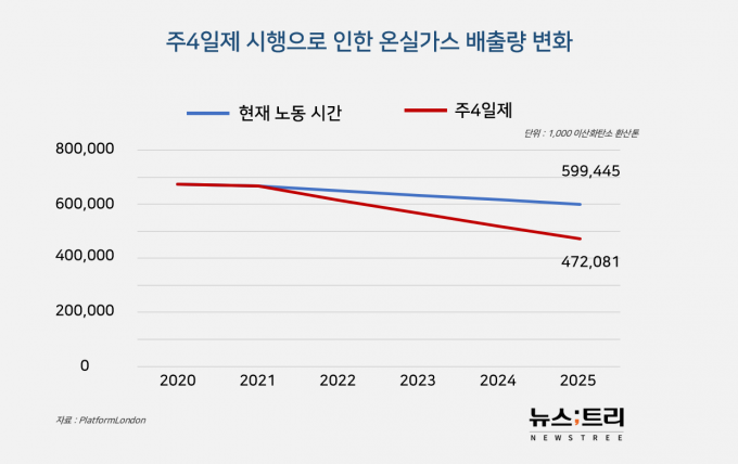 영국 환경 및 사회단체인 플랫폼런던(PlatformLondon)은 '시간을 멈춰라'(Stop the Clock)라는 보고서를 통해 주4일 근무제로 전환되면 2025년까지 온실가스 배출이 연간 1억2700만톤까지 줄어든다고 분석했다. 1억2700만톤의 탄소는 영국 전체 온실가스 배출량의 21.3%에 해당하고, 스위스의 전체 탄소 배출량보다 많다. 또 차량 2700만대가 내뿜는 탄소 배출량과 같다.