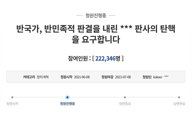지난 8일 청와대 국민청원 게시판에 "반국가, 반민족적 판결을 내린 *** 판사의 탄핵을 요구합니다"라는 제목으로 게재된 이 청원은 9일 오전 11시께 청원 동의 참여인원수 20만명을 돌파했다. 청와대 국민청원 게시물이 30일 내 20만개 이상 추천을 받으면 정부나 청와대 관계자들은 공식 답변을 제공해야 한다.