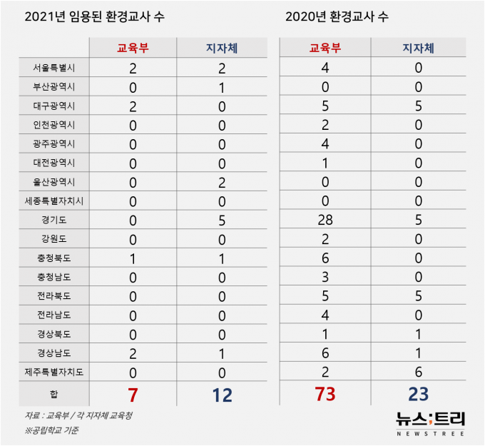 올해 임용된 환경교사의 수도 교육부와 지자체가 달랐다. 교육부는 올해 임용된 환경교사는 7명이라고 했지만 지자체는 12명이라고 했다. 2배나 차이났다. 특히 경기도의 환경교사 수는 제각각이었다. 교육부는 경기도의 환경교사 수가 28명이라고 했지만, 지자체인 경기도는 5명이라고 했다. 또 교육부는 경기도에 올해 임용된 환경교사가 0명이라고 밝힌 반면, 지자체는 5명이라고 했다.