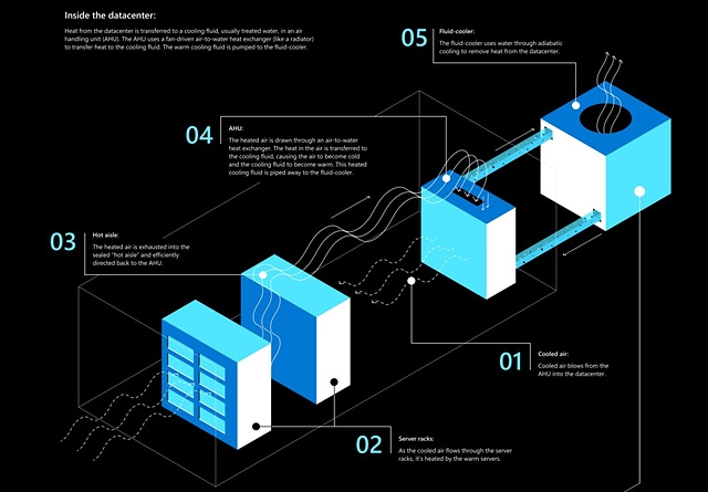 '미국 서부3' 데이터센터는 냉각수로 공기를 식혀 온도를 유지한다. 공기를 식히느라 온도가 올라간 냉각수는 송수관을 타고 외부 냉각실로 이동한다. 냉각수는 이곳에서 증발하도록 방치된다. 증발한 냉각수는 상단 수분 필터로 걸러 재사용되고, 오직 열만 외부로 방출된다.