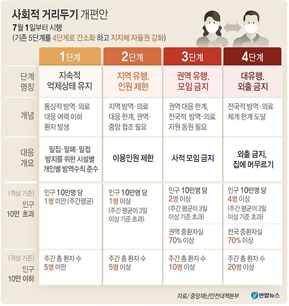 정부는 7월부터 코로나19 대응을 위한 '사회적 거리두기'를 4단계로 간소화한다고 밝혔다. 현행 5단계(1→1.5→2→2.5→3단계) 거리두기가 유행정도에 따라 '억제'(1단계), '지역유행'(2단계), '권역유행'(3단계), '대유행'(4단계) 4단계로 바뀐다.