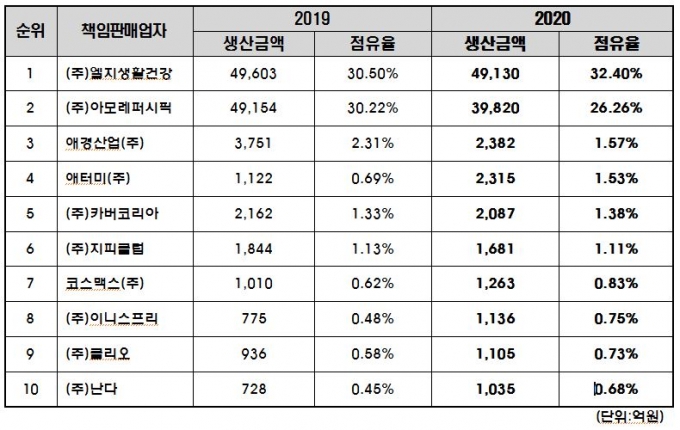 지난해 화장품 생산실적은 15조1618억원으로, 2019년보다 6.8% 감소했다. 코로나19 여파로 손세정제 등 인체세정용 제품류는 전년보다 20.5% 증가했다. 또 마스크 착용과 '사회적 거리두기' 등으로 색조화장품 생산은 21.5% 줄어든 반면 눈화장 제품류는 0.3% 증가했다.
