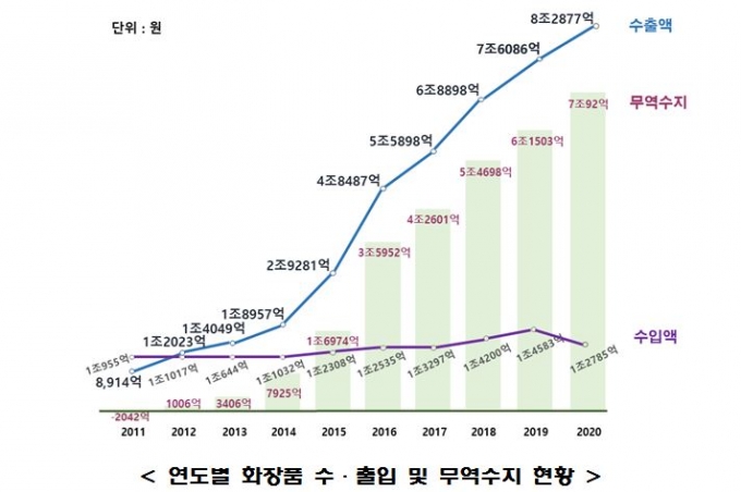 덕분에 화장품 무역수지는 지난해 7조92억원(약 64억400만달러)로 집계돼 9년 연속 흑자행진을 이었다. 이는 우리나라 전체 무역수지 흑자 규모(448억6528만달러)의 14.3% 비중이다. 2016년만 해도 화장품 무역수지 비중은 전체의 3.5% 수준에 불과했지만 해마다 비중이 커지면서 2019년에도 13.6%에 달했다.