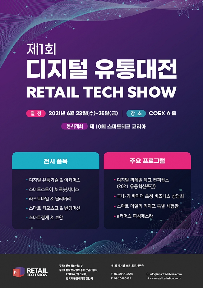 ◇ 제1회 디지털 유통대전 ·장소 : 코엑스 ·날짜 : 2021년 6월 23일(수) ~ 6월 25일(금) 국내 이커머스 기업과 스타트업, 전문가들이 한자리에 모여 디지털 유통의 최신 기술과 흐름을 공유하는 '제1회 디지털 유통대전'이 오는 23일부터 3일간 서울 삼성동 코엑스에서 개최된다.