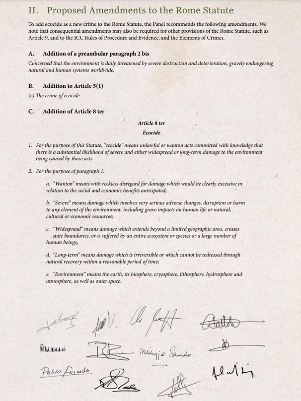 현재 국제형사재판소(ICC)가 기소할 수 있는 국제범죄는 △전쟁 범죄 △반인도적 범죄 △집단 살해 △침략 범죄 등 4가지다. 스톱 에코사이드는 여기에 '환경범죄'를 추가시켜 국제형사재판소가 환경을 파괴하는 국가나 기업 등을 기소하고 처벌할 수 있도록 하겠다는 것이다.