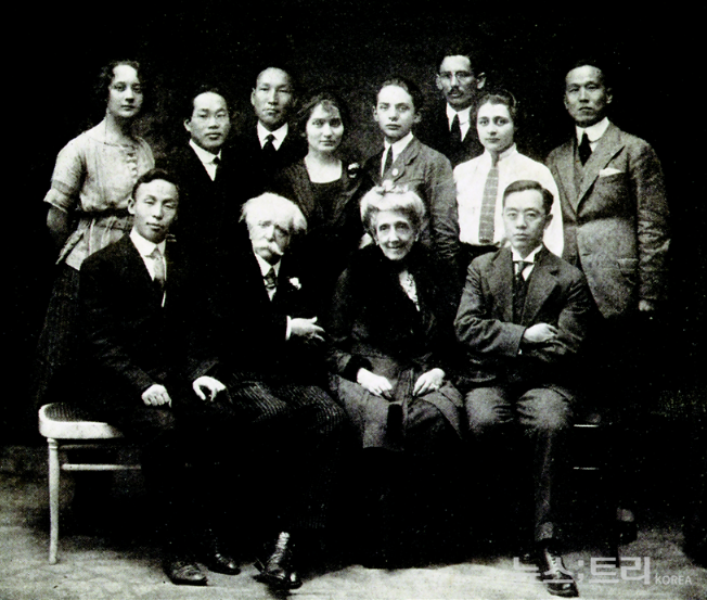 ▲대한민국임시정부 파리위원부 간부들이 파리강화회의 종료직후인 1919년 7월 활동을 도와준 프랑스인들과 함께 찍은 사진. 앞줄 맨왼쪽이 여운홍, 맨오른쪽이 김규식. 뒷줄 왼쪽에서 두번째가 이관용, 셋번째가 조소앙. 파리로 파견된 김규식은 처음에 회의장에 들어가지 못했다. 신한청년당 대표로 갔지만 국가 대표가 아니었기 때문이다. 이에 급히 상해 대한민국임시정부는 김규식을 외무총장과 파리강화회의 대한민국 위원겸 주(駐) 파리한국통신국 대표위원으로 임명하고 신임장을 파리로 발송했다. 이때가 1919년 4월 11일 임시정부가 수립된지 이틀뒤인 4월 13일이었다. 그만큼 상황이 급박했음이 드러난다.